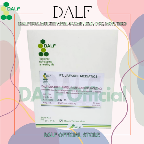 DALF DOA Multi Panel 5 adalah tes cepat untuk mendeteksi kualitatif simultan dari beberapa obat dan metabolit obat dalam urin manusia. Untuk digunakan oleh profesional kesehatan termasuk profesional di tempat perawatan. Immunoassay hanya untuk penggunaan diagnostik in vitro.